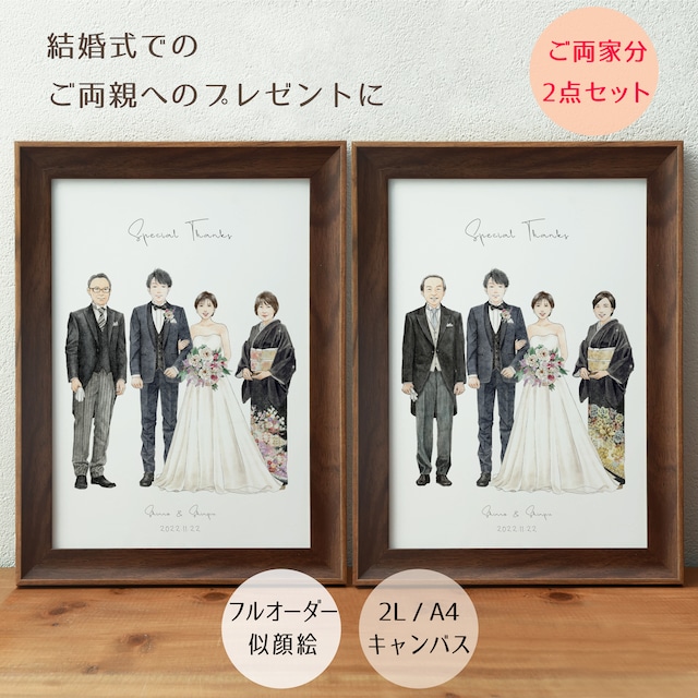 結婚式・結婚記念に、ご両親への感謝の気持ちを込めて、似顔絵のプレゼントはいかがですか? 普段なかなか言葉にできない感謝の言葉を添えて感謝状としても。 *Instagram(@atelier_01_ichi)にも作品を掲載しております。一度ご覧くださいませ。 https://www.instagram.com/atelier_01_ichi/ ======================= ◼︎表示価格は【2Lサイズ】2点セット 「新郎新婦様+ご両家ご両親様」の計6名分のイラスト制作費が含まれます(新郎新婦様はご両家分とも同じイラスト) セット内容詳細はこちら→ https://atelier01.base.shop/blog/2022/01/15/143226 ◼︎ サイズ変更、ペット/人物イラストの追加、背景の描画、和装着用(留袖・色打掛)、額装はオプション対応となります(下記参照) ======================= _______________________ 作品について  ̄ ̄ ̄ ̄ ̄ ̄ ̄ ̄ ̄ ̄ ̄ ̄ ̄ ̄ ̄ ̄ ̄ ̄ ̄ ̄ ̄ ̄ ̄ ◼︎ お写真の通りイラスト化するのはもちろん、お顔の写真があればポーズ・衣装など様々なご要望をもとに描くこともできます。 礼服はもちろん、私服もOK。並びも文字も全て自由なフルオーダー。 詳しくは https://atelier01.base.shop/blog/2022/05/11/160320 ◼︎ 水彩とペンで手描きしたイラストをデータ化し、マット紙 or キャンバスに印刷します。 _______________________ ご注文の流れ  ̄ ̄ ̄ ̄ ̄ ̄ ̄ ̄ ̄ ̄ ̄ ̄ ̄ ̄ ̄ ̄ ̄ ̄ ̄ ̄ ̄ ̄ ̄ ① ご注文(サイズとオプションの選択をお間違いのないようご注意ください) ↓ ② ご注文の確認後、当店よりメールにて参考用お写真のご提出についてご案内。ご要望詳細も伺います。 ↓ ③ お写真をご提出いただき、制作内容が確定したら制作開始 ↓ ④ イラスト完成後、確認用画像にて修正箇所等の確認をしていただきます。 ↓ ⑤ 印刷・発送(2L・A4額縁なしはクリックポスト/他は宅急便) ※お写真のご提出から3~4週間後。お急ぎの方はご注文前にお問い合わせください。 _______________________ オプション  ̄ ̄ ̄ ̄ ̄ ̄ ̄ ̄ ̄ ̄ ̄ ̄ ̄ ̄ ̄ ̄ ̄ ̄ ̄ ̄ ̄ ̄ ̄ ◼︎ サイズ ・2Lマット紙(127×178mm):+0円 ・A4マット紙(210×297mm):+2,000円 ・キャンバスSM号(158×227×18mm):+4,000円 ・キャンバスF3号(220×273×18mm):+6,000円 ◼︎ 和装着用 ・白無垢:追加料金なし。 ・色打掛:+1,000円 / 1名 ・留袖:+1,000円 / 1名 ※サンプル画像〈おまかせ黒留袖の種類〉よりお選びいただく場合は追加料金なし。 ◼︎ イラスト追加 ・ペット追加:+1,000円 / 1匹 ・子供(小学生まで)追加:+1,500円 / 1名 ・大人追加:+2,500円 / 1名 ・全面風景:+3,000円 (キャンバス側面は印刷されません) ◼︎ 額縁(2点セット) ・2L:+2,000円 ・A4:+6,000円 ※キャンバスは対応しておりません。 ご希望の内容がオプション項目にない場合やご不明点は、お気軽にお問い合わせください。 _______________________ 注意事項  ̄ ̄ ̄ ̄ ̄ ̄ ̄ ̄ ̄ ̄ ̄ ̄ ̄ ̄ ̄ ̄ ̄ ̄ ̄ ̄ ̄ ̄ ̄ ・ご購入後のキャンセル・返品は対応致しかねます。 ・プレゼント用のラッピングは対応しておりません。 ・ご注文翌日以内にメールが届かない場合、各種お問い合わせ機能よりお問い合わせいただくか、迷惑メールフォルダのご確認をお願いいたします。